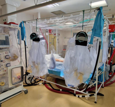PCS Isolators’ units surround the patient or equipment in clear PVC envelopes with controlled ventilation. Patients are cared for via specially designed